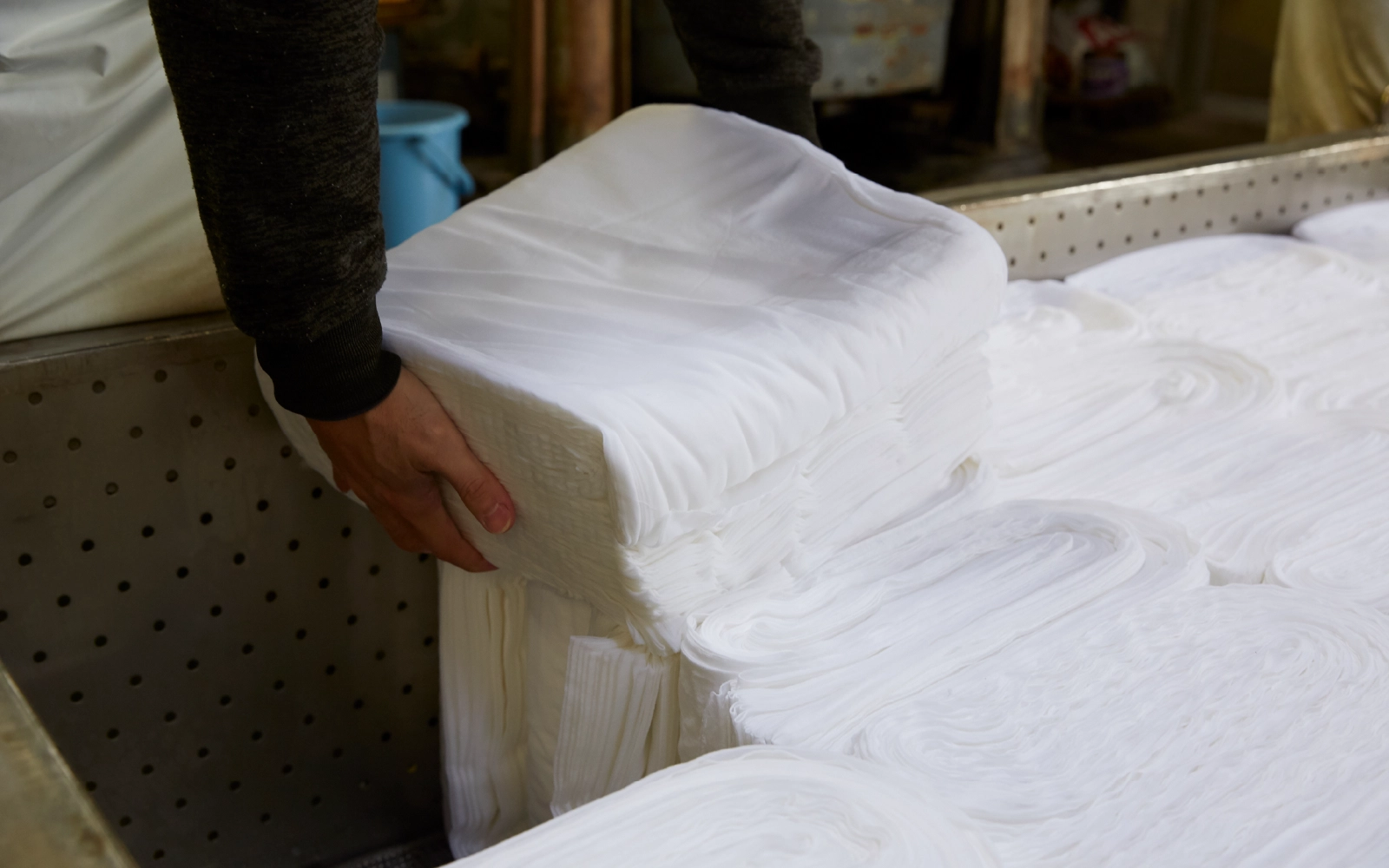 和晒は、織りあがったそのままの状態の生地を使用します。もちろん毛羽は、そのまま残っています。この毛羽と、繊維にストレスをかけない和晒の製法が、生地そのものに高い吸水性・通気性・保温性を与え、心地よい肌触りを実現します。