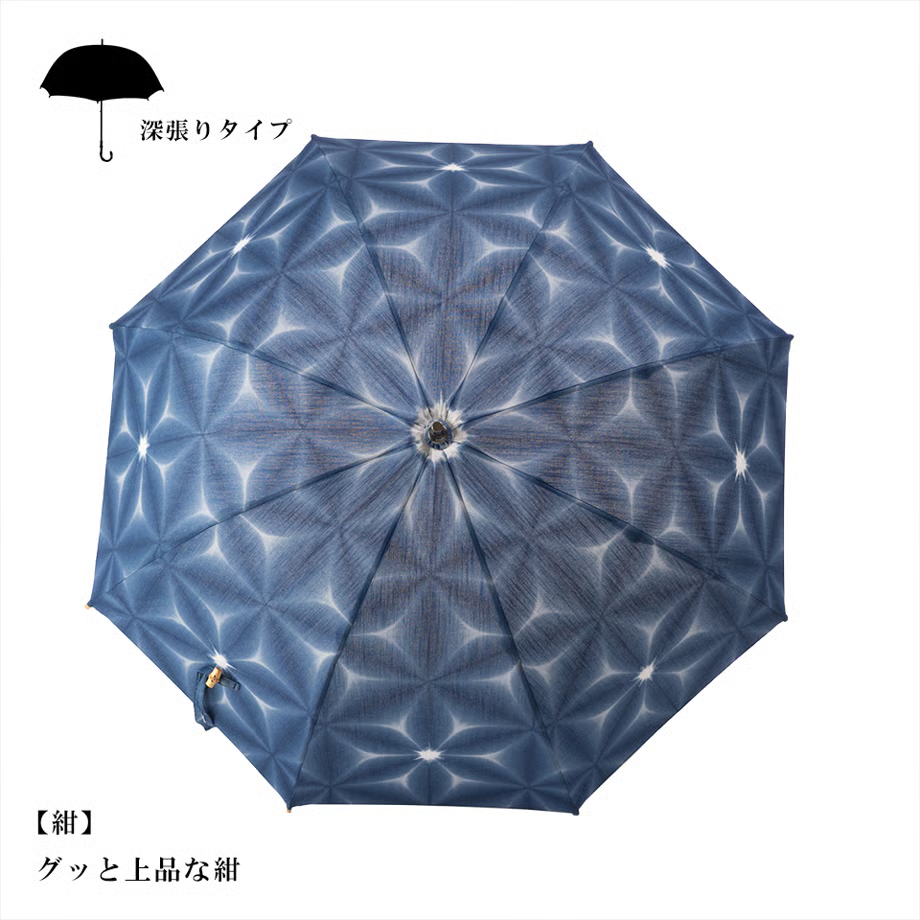 今までの絞り染めの傘にはない、コロンとしたシルエットの深張りタイプ