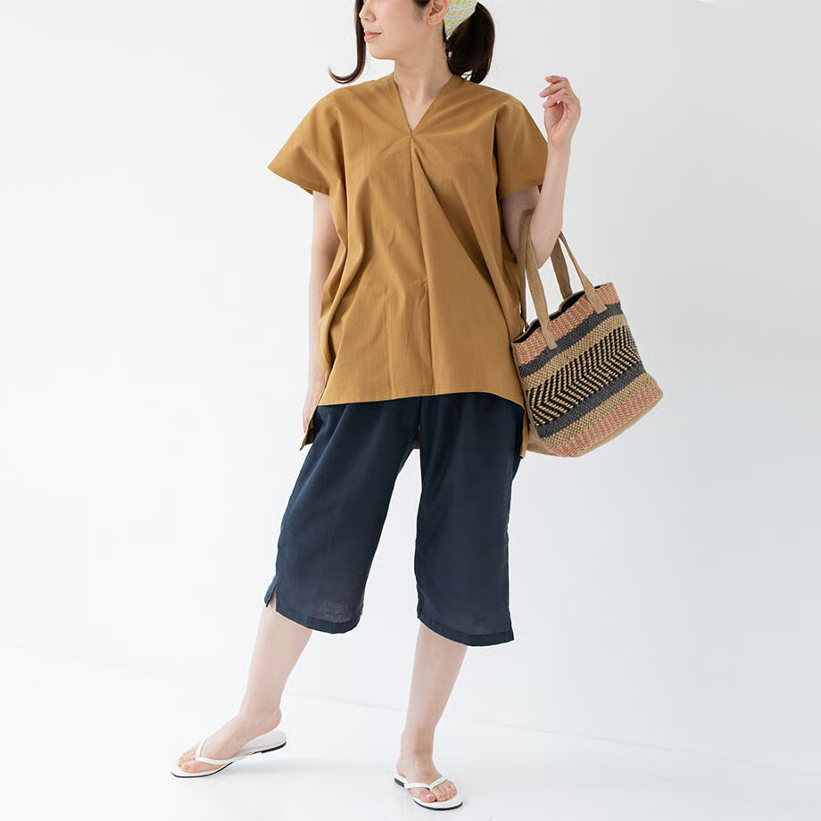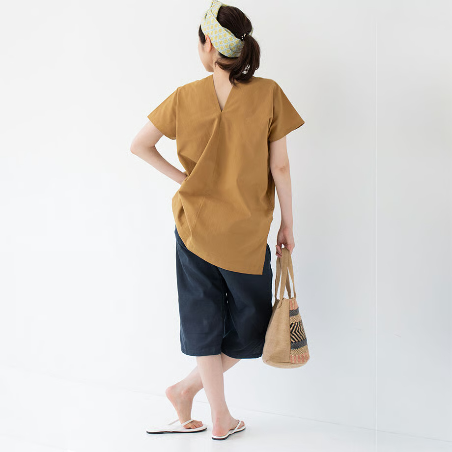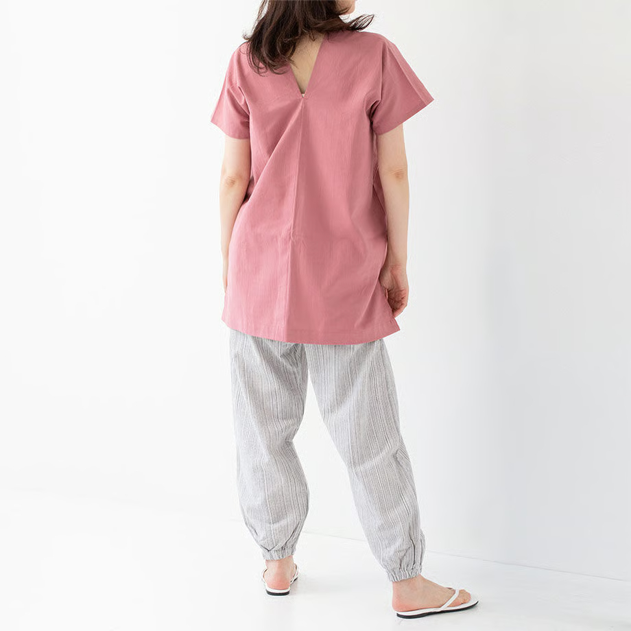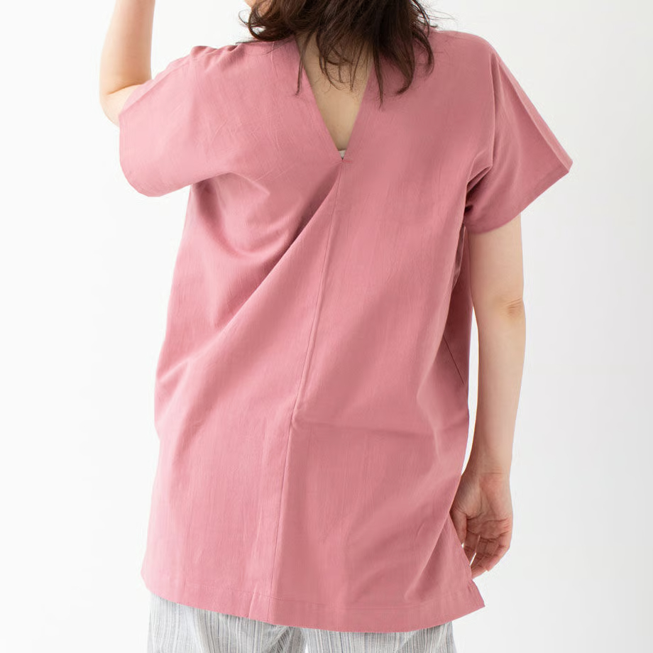 シンプルな形が魅力的で、パンツと合わせるのはもちろん、ショートパンツやスカートに合わせても◎ 写真はカドノさらし染めのステテコを合わせてみました。後の襟ぐりもVネックになっており、首回りすっきり。