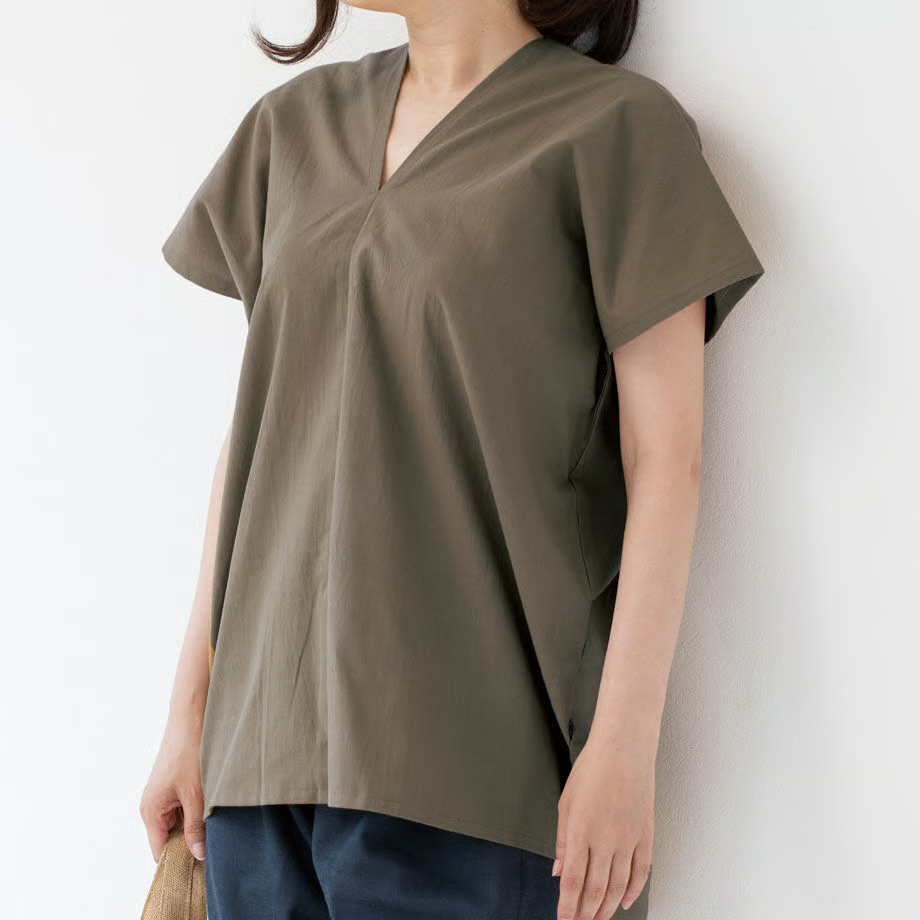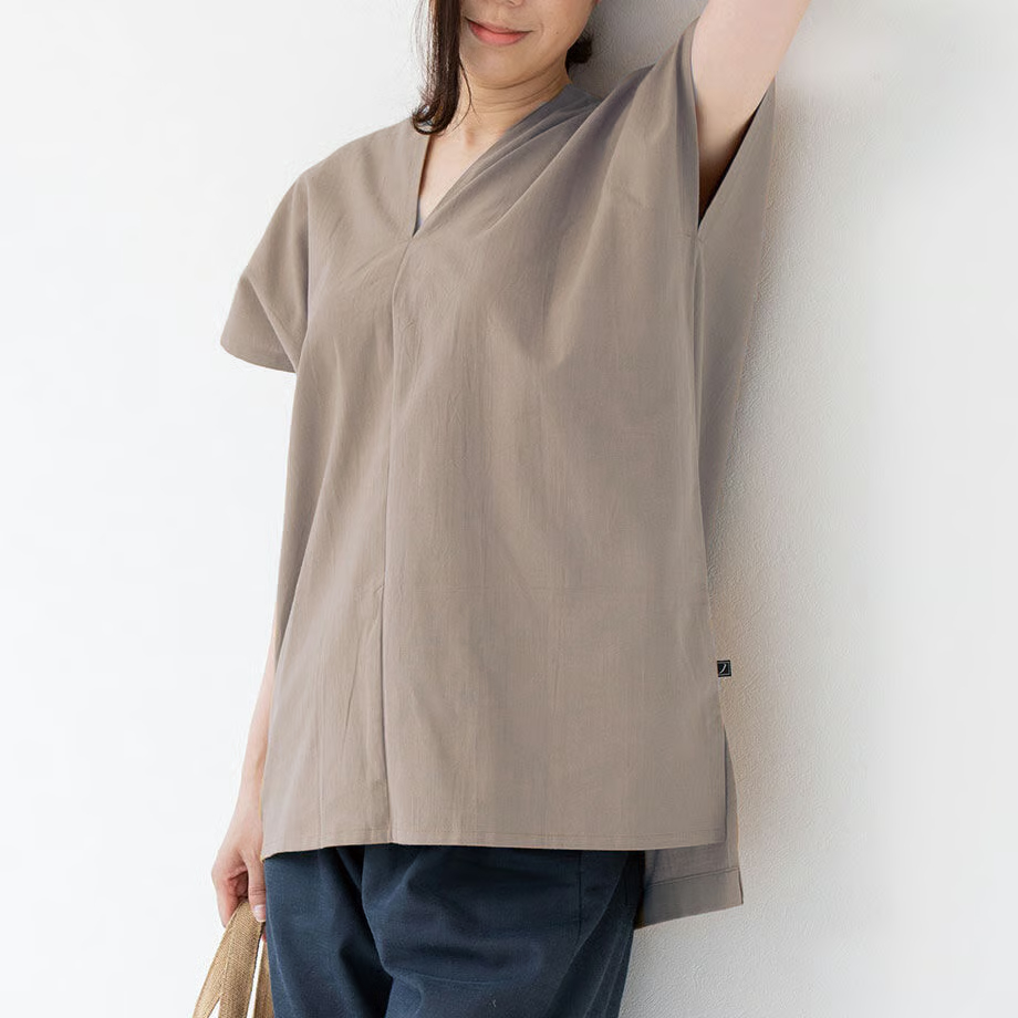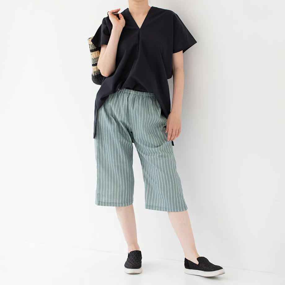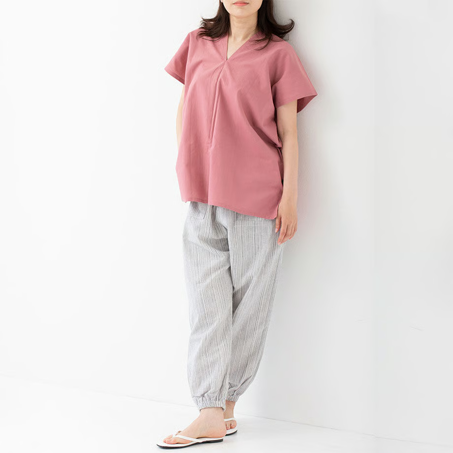 シンプルな形が魅力的で、パンツと合わせるのはもちろん、ショートパンツやスカートに合わせても◎ 写真はカドノさらし染めのステテコを合わせてみました。後の襟ぐりもVネックになっており、首回りすっきり。