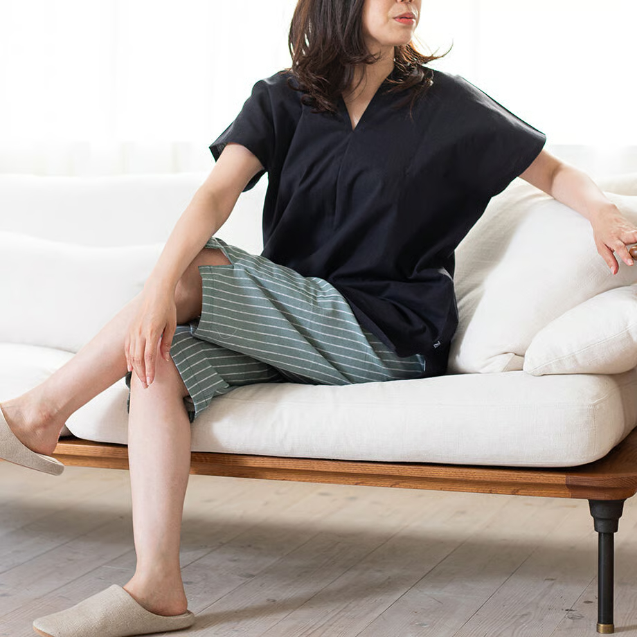 締め付け感のないデザインは、お部屋の中でもお出かけでもリラックス。さっと着ることができ、日常で気軽にお使い頂けます。洗えば洗うほどに柔らかくなり、着心地がUPする和晒の生地ですので、是非、様々なスタイルでお楽しみいただき、ヘビーローテーションしてくださいね。