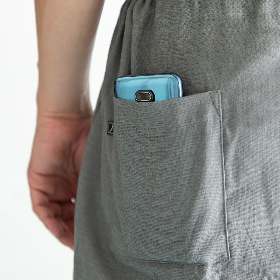 裾にスリットが入っていますので、動きやすく、ウエストの内側に紐がありますのでお好みに合わせて締め付けも調整できます。また、後ろにはポケットが1つ。スマホなどを入れるのに便利です。