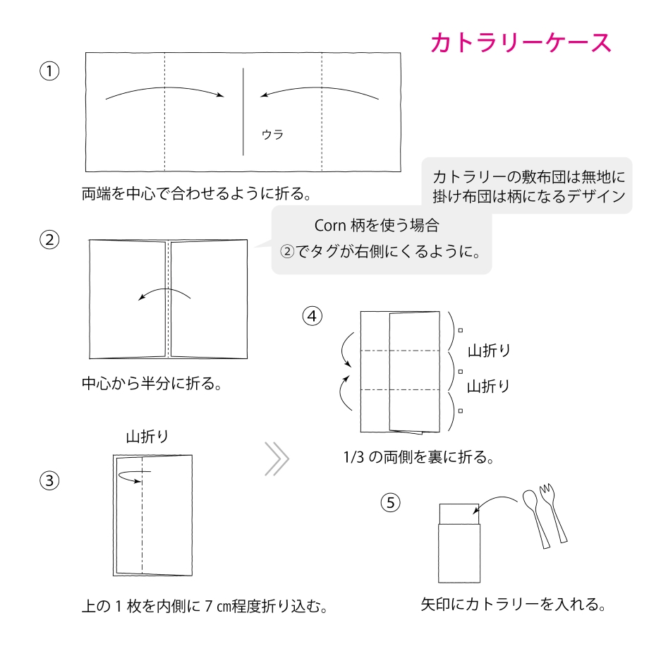 カトラリーを包んで、おもてなしの食卓を彩ってみてはいかがでしょうか?カトラリーのベッドは敷布団が無地、着布団がコーン柄になるすっきりデザインです。食事の時は膝掛けナプキンとして使えるから、カジュアルなおもてなしにぴったりです。