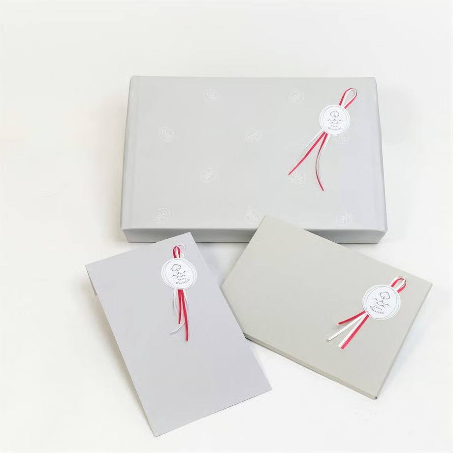 くらす和晒では、お誕生日プレゼントや各種お祝いなど贈り物向けに、 紅白サテンリボン&オリジナルステッカー付の専用ギフト包装をご用意しております。